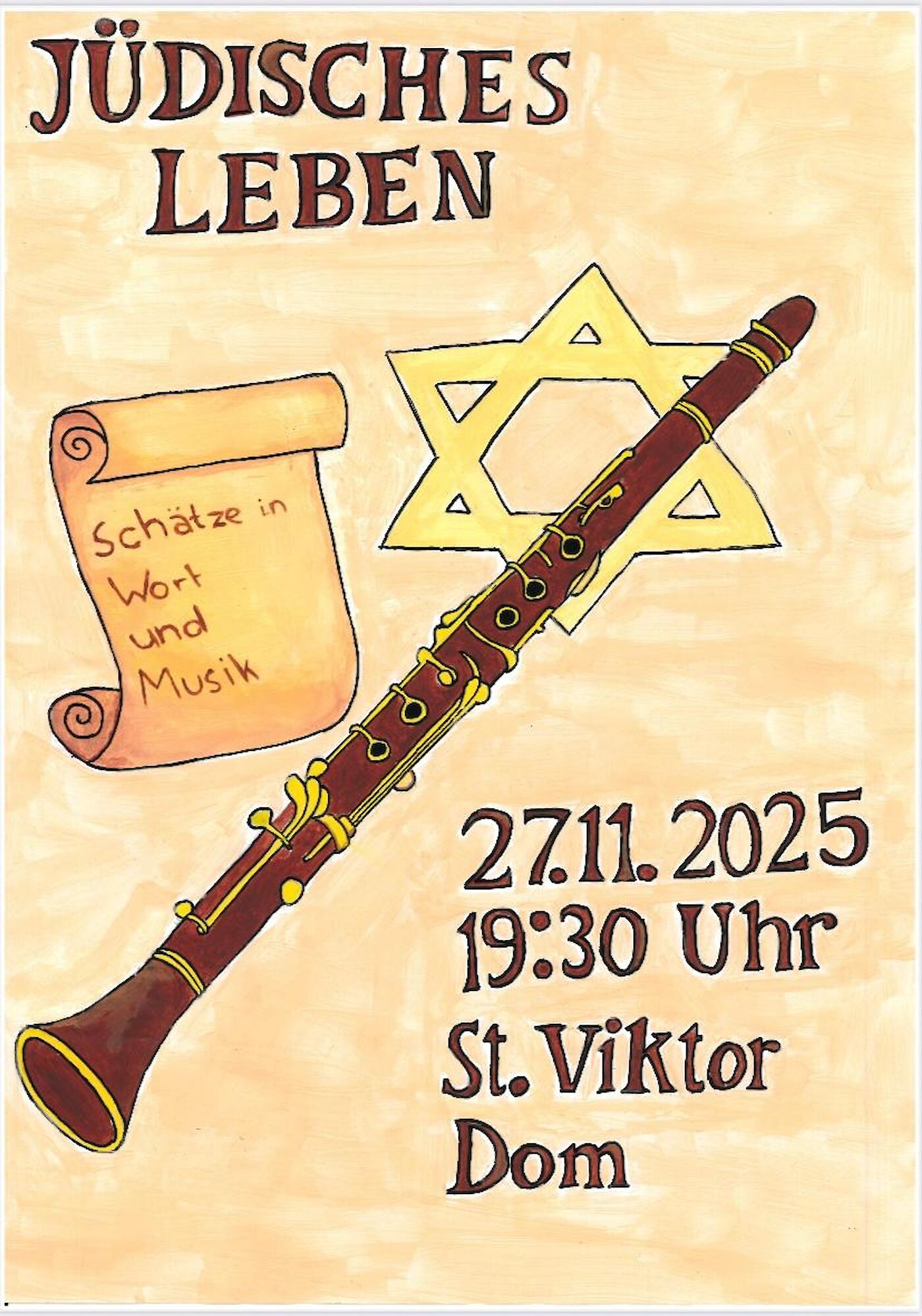 Einen musi­ka­li­schen und lite­ra­ri­schen Bei­trag der beson­de­ren Art bie­tet der Chor und Schü­le­rin­nen und Schü­ler des Stifts­gym­na­si­ums Xan­ten an. Unter der Lei­tung der Lehr­kräf­te Mai­ke Freund, Ans­gar Schön­ber­ner und Jen­ny Wie­chers wer­den aus­ge­such­te Stü­cke jüdi­scher Künst­le­rin­nen und Künst­ler im St. Vik­tor Dom im Rah­men der LVR – Aus­stel­lung 1700 Jah­re jüdi­sches Leben in Deutsch­land“ dar­ge­bo­ten. Schü­le­rin­nen und Schü­ler der Jahr­gangs­stu­fe 10 und der Ober­stu­fe wer­den ergän­zend lite­r­a­rir­sche Tex­te und Erfah­run­gen aus dem Leben von Jüdin­nen und Juden vor­stel­len. Die Schü­le­rin­nen und Schü­ler prä­sen­tie­ren die­se Ver­an­stal­tung unter dem Titel Jüdi­sches Leben – Schät­ze in Wort und Musik“.