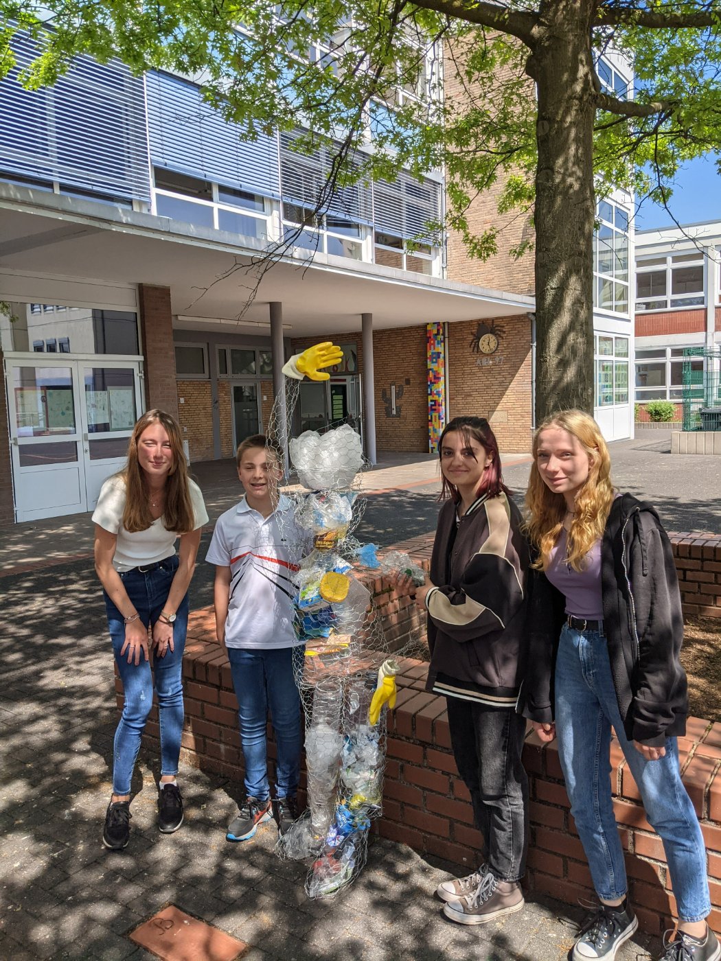 Teils in neuer Besetzung, trafen sich die insgesamt 28 Schülerinnen und Schüler und die sechs betreuenden Lehrkräfte am 9. Mai in Xanten. Bereits im Oktober 2019 hatte es in Buchy das erste Treffen der Gruppe gegeben, bei dem der Blick der SchülerInnen für die Problematik von Plastikmüll geschärft wurde. An den Projekttagen in Xanten wurde der Mensch als Konsument von Plastik in den Fokus gerückt, wobei die SchülerInnen z.B. gemeinsam Drahtfiguren bauten, die mit Plastikmüll gefüllt wurden, die die deutschen Familien eine Woche lang zuvor gesammelt hatten. So wurde schnell deutlich, wieviel Müll pro Haushalt anfällt.