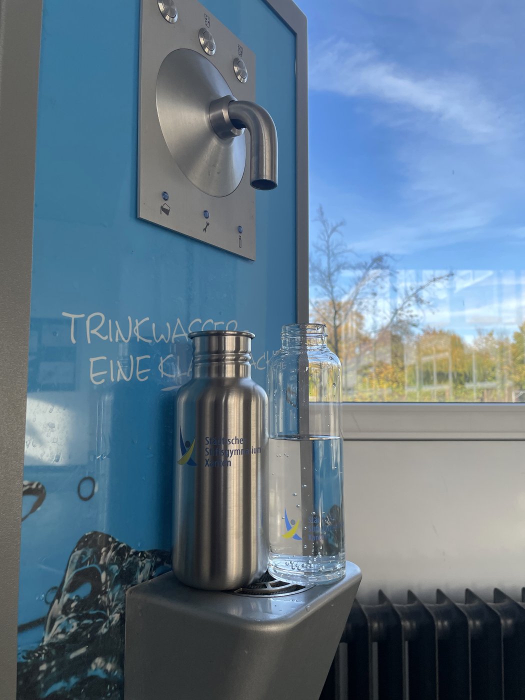 Die SV hat schon vor einiger Zeit den Wünsch ihrer Mitschüler:innen aufgenommen, Trinkflaschen mit unserem Schullogo ins Angebot aufzunehmen. Nach einem gemeinsamen Entscheidungsprozess unter Beteiligung von Schüler:innen, Eltern und Lehrer:innen und ein wenig Wartezeit bis zur Fertigstellung ist es nun endlich soweit. Die etwas kleinere Glasflasche der Firma spottle kann für 10 €, die Edestahl-Variante der Firma kleenkanteen für 15€ erworben werden. Die Preise sind so unschlagbar, weil die SV sich dazu entschieden hat, einen Zuschuss für die Anschaffung der Flaschen beizutragen. Jetzt steht dem Zugang zu frischem, sprudeligem Wasser aus unserem Wasserspender nichts mehr im Wege. Die drei Kanditaten geben ein gutes Team ab, nicht wahr?